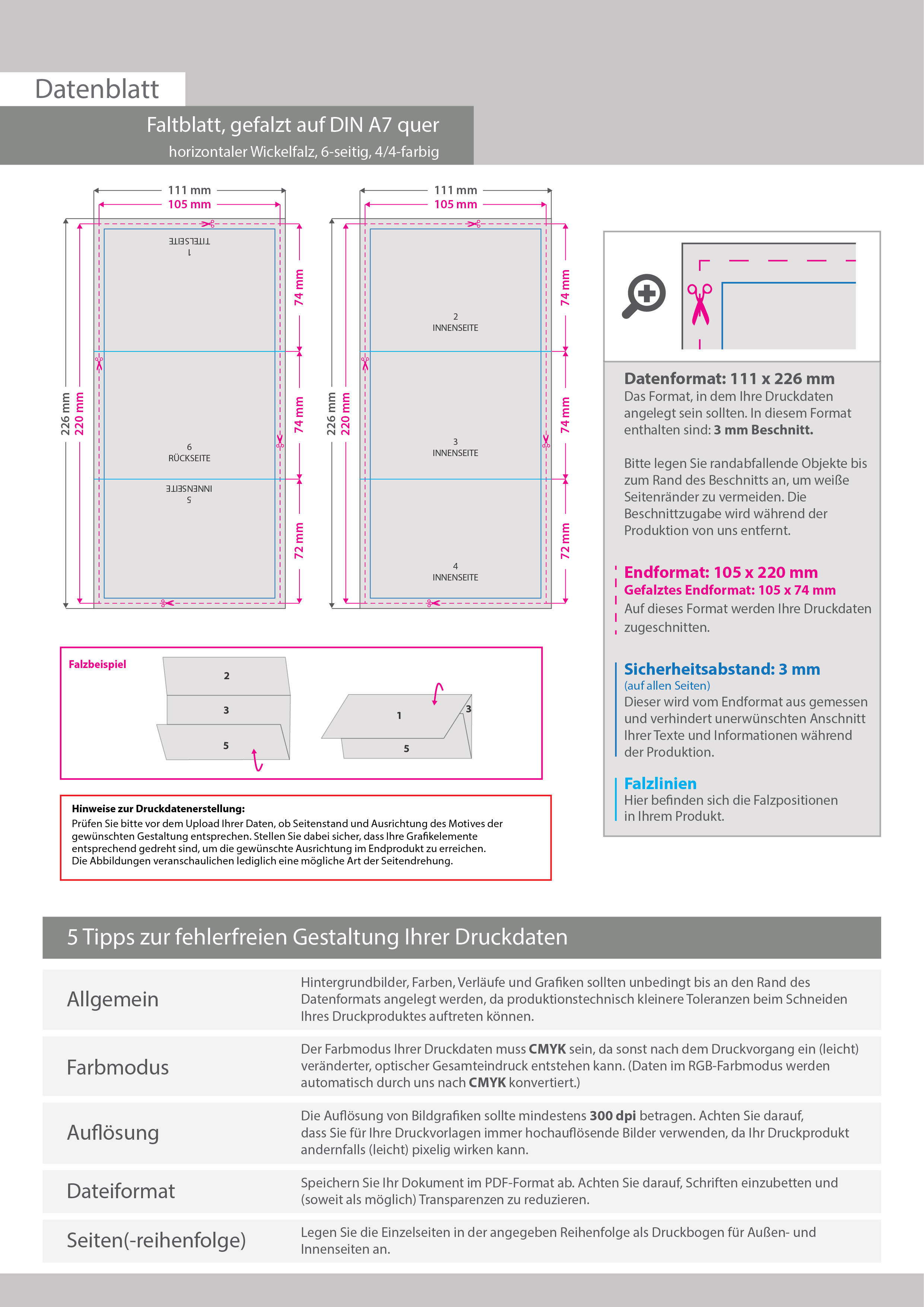 Faltblatt, gefalzt auf DIN A7 quer, horizontaler Wickelfalz, 6-seitig